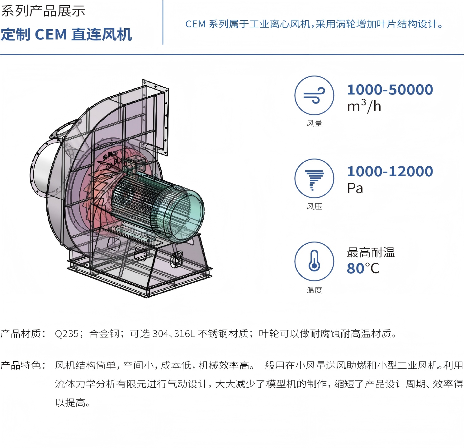 描述:CEM系列属于高压鼓风机,采用涡轮增加叶片结构设计。
